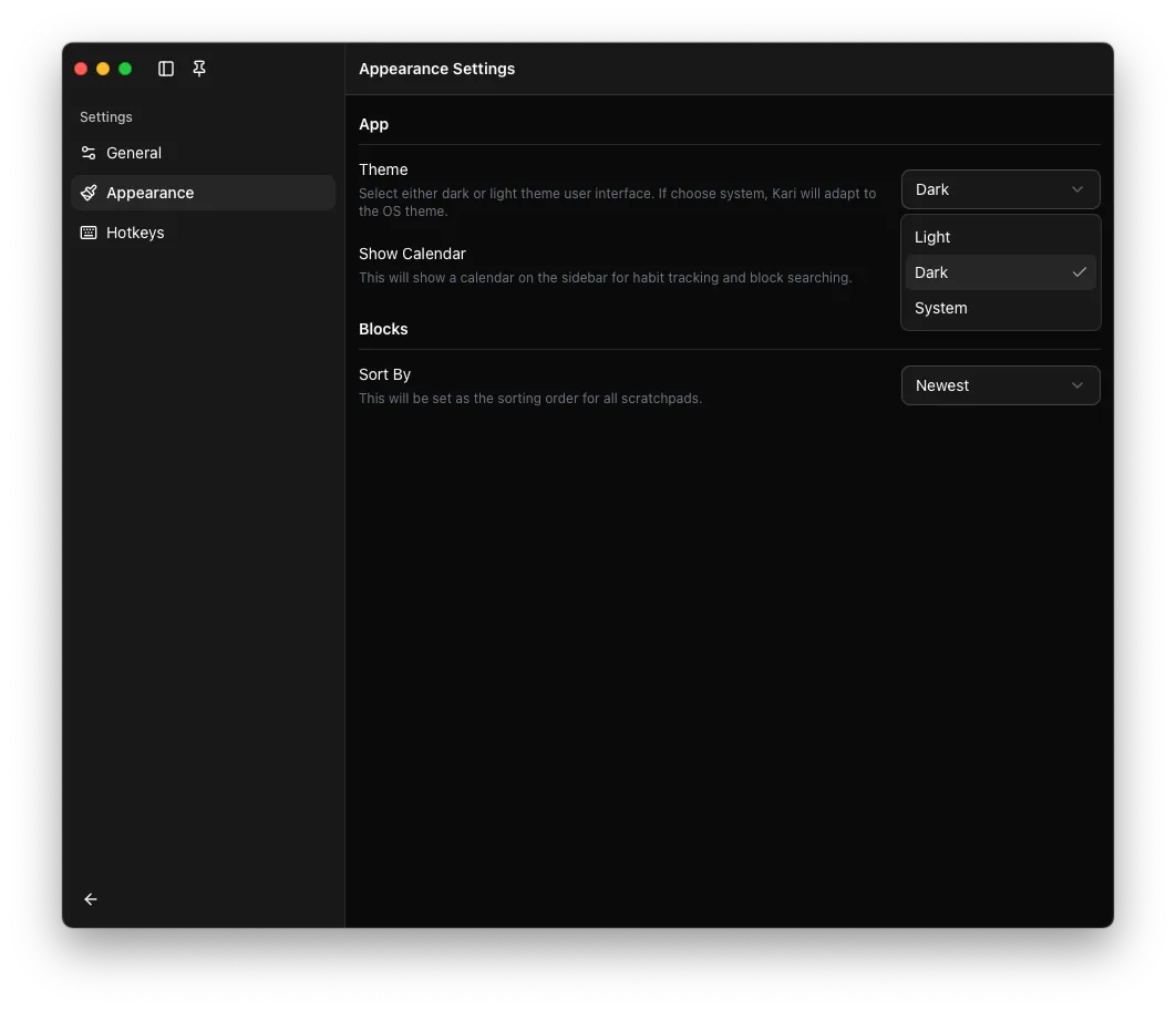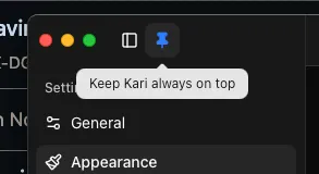 Now you can keep Kari always on top by clicking the pin on the top left, next to the collapse sidebar toggle!